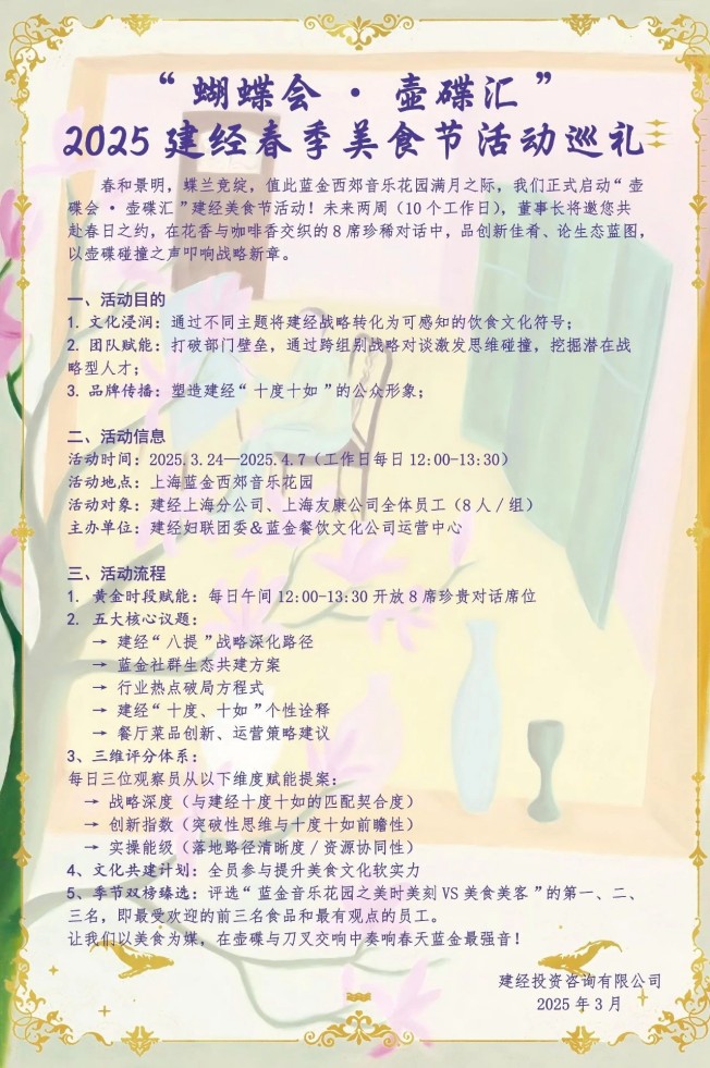 人間四月,草長鶯飛。春日的上海,藍金西郊音樂花園花香與咖啡香交織,一場別開生面的“蝴蝶會?壺碟匯”建經咨詢春季美食節在此啟幕。此次活動由建經咨詢團委、婦聯與藍金餐飲文化公司運營中心聯合主辦,每日午間12:00-13:30開放8席珍貴對話席位,董事長與來自總部、上海分公司、友康設計院等不同部門的員工,在刀叉與壺碟的交響中,以美食為橋梁,圍繞建經咨詢“八提”戰略深化路徑、藍金社群生態共建方案、行業熱點破局方程式、建經咨詢“十度、十如”個性詮釋、餐廳菜品創新與運營策略建議五大核心議題,展開了一場場兼具專業性與創新性的頭腦風暴。