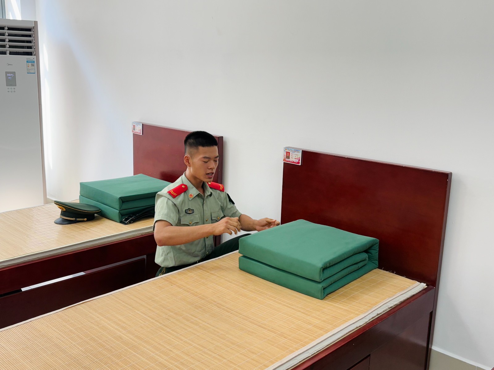 隨后,引導(dǎo)員帶領(lǐng)活動(dòng)人員參觀內(nèi)務(wù)室,戰(zhàn)士現(xiàn)場(chǎng)演示部隊(duì)內(nèi)務(wù)整理流程,其嚴(yán)謹(jǐn)自律的生活作風(fēng)令在場(chǎng)人員深受觸動(dòng)。在宿舍,戰(zhàn)士以 “鋪、折、曲、合、整” 五步法演示疊軍被:先將軍被鋪開并規(guī)范對(duì)折,對(duì)準(zhǔn)折痕后細(xì)致處理內(nèi)部棉花以防褶皺,再精準(zhǔn)確定角度與位置完成折疊,最后耐心修整,使軍被呈現(xiàn)出方正整潔的形態(tài)。戰(zhàn)士提到 “被子三分靠疊,七分靠整”,強(qiáng)調(diào)日積月累的重要性,這與軍事訓(xùn)練中 “無(wú)長(zhǎng)年累月摸爬滾打,難練出克敵制勝本領(lǐng)” 的道理一脈相承,讓在場(chǎng)人員直觀體會(huì)到部隊(duì) “細(xì)節(jié)見作風(fēng)、堅(jiān)持成習(xí)慣” 的嚴(yán)謹(jǐn)態(tài)度。